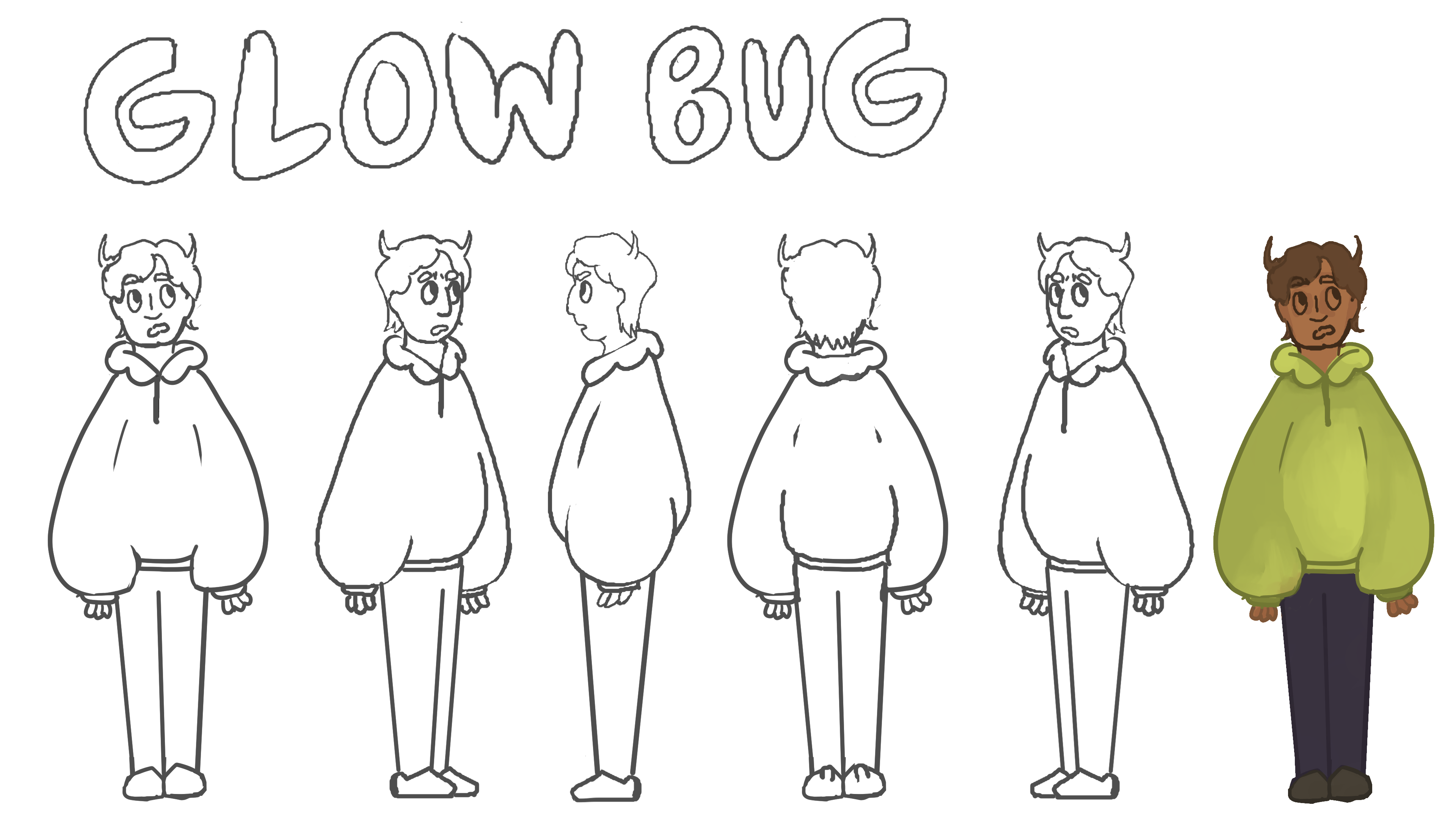 Glowbug is a relatively young person with a bubbly out going personality. They are always the first person to start a conversation and are easily excitable. their character design was inspired by glow bugs!!!